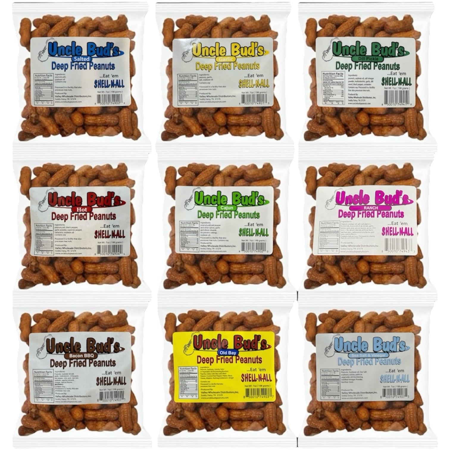 Uncle Bud's Deep Fried Peanuts - a delicious snacking experience that you won't want to miss! With 9 mouthwatering flavors, these peanuts are sure to satisfy any craving.